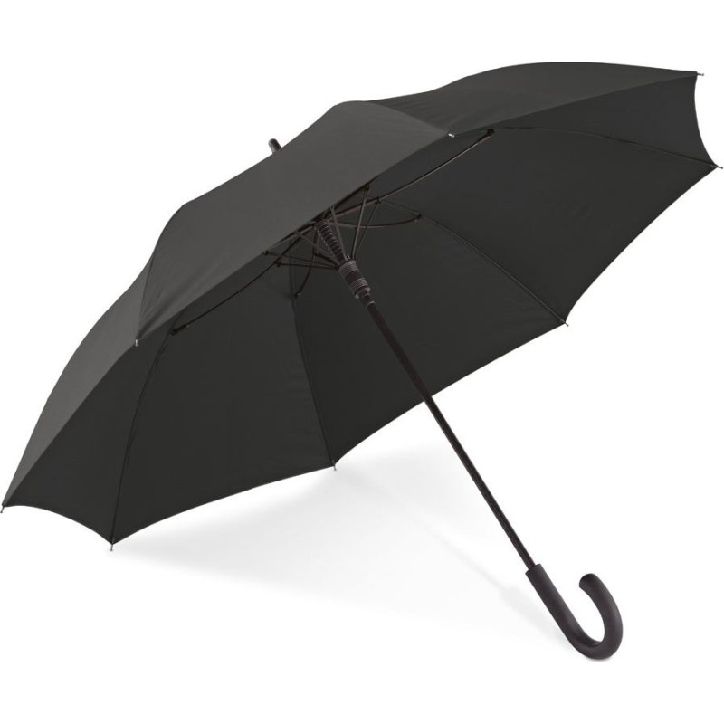 Pongee 190T umbrella with fiberglass shaft and ribs, and rubber coated handle. This umbrella is windproof and has automatic opening. ø1030 x 890 mm