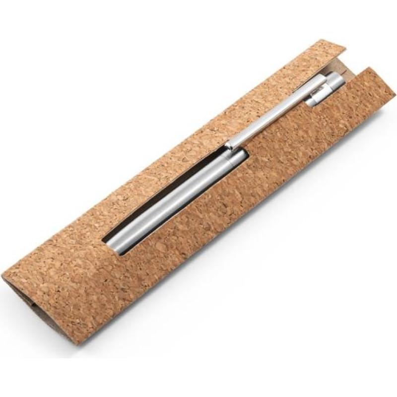 Ballpoint pen with stainless steel body (53% rSS) and clip. The ballpoint pen has blue ink and a twist mechanism. Supplied in a cork gift pouch. Ballpoint pen: ø11 x 133 mm | Pouch: 155 x 40 mm