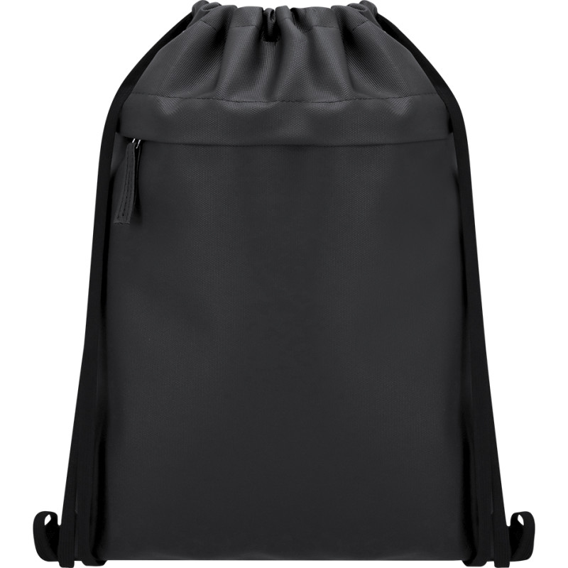 Drawstring backpack made of soft PU combined with durable 600D polyester. Features a functional front pocket with zipper closure and matching PU puller.