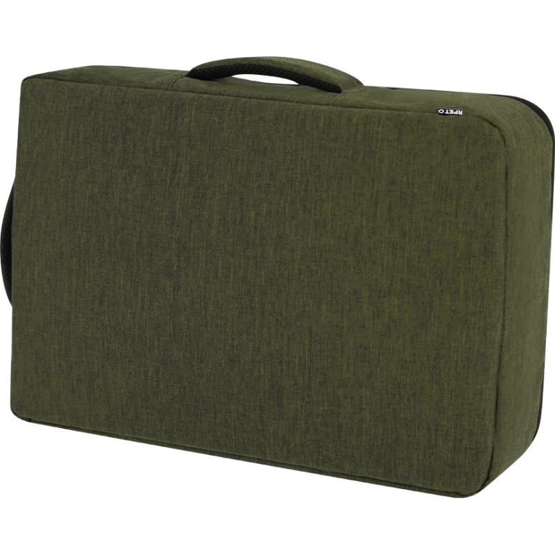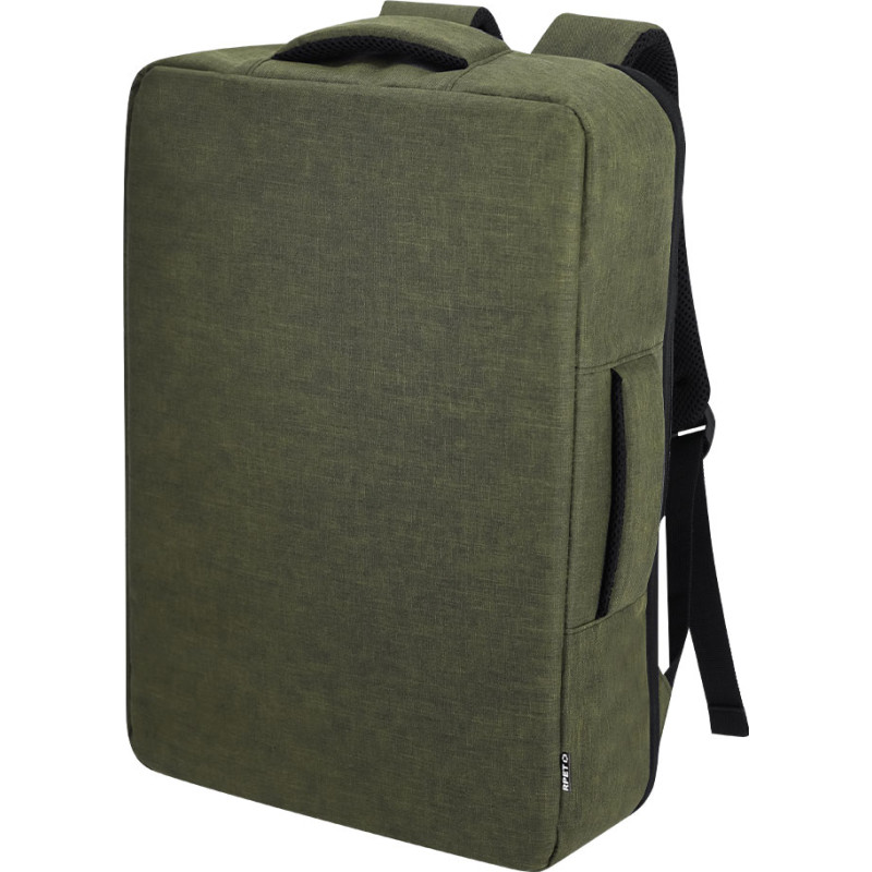 Document holder backpack made from durable RPET 300D. It features an urban design that incorporates a main pocket with a hidden zipper closure for added protection, with dual pullers. Includes a padded interior for laptops up to 15 inches, additional pockets inside for small items. Its shoulder straps and back are padded and adjustable for added comfort. Offers three transport modes: as a backpack, thanks to the padded shoulder straps; as a document holder, thanks to its carrying handle; and a strap for a trolley. The RPET material is made from recycled plastic, promoting the reuse of plastic waste and helping the planet's sustainability.