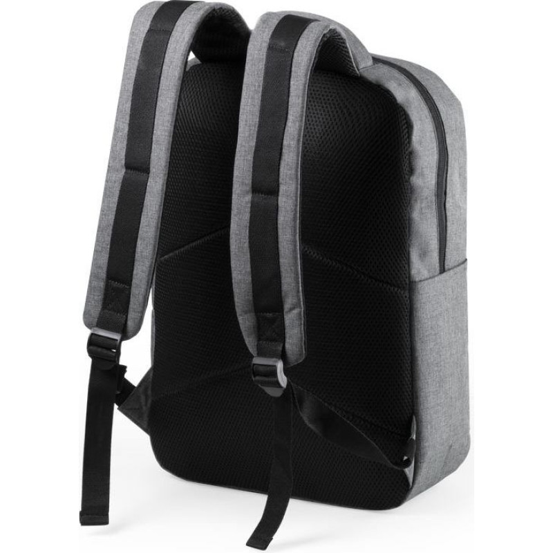 Business backpack in resistant 600D RPET material, obtained from recycled plastic materials, to encourage the reusing of plastic residues and contribute to the Earth’s sustainability. With double puller zipper pocket and front pocket. Inside compartment with padded pockets for tablet up to 10 inches size and laptop up to 15 inches size, including USB connection for mobile devices charging (cable included, auxiliary battery not included). Reinforced corners and accessories in black color. With padded back and adjustable, padded, shoulder straps. RPET distinctive in label.