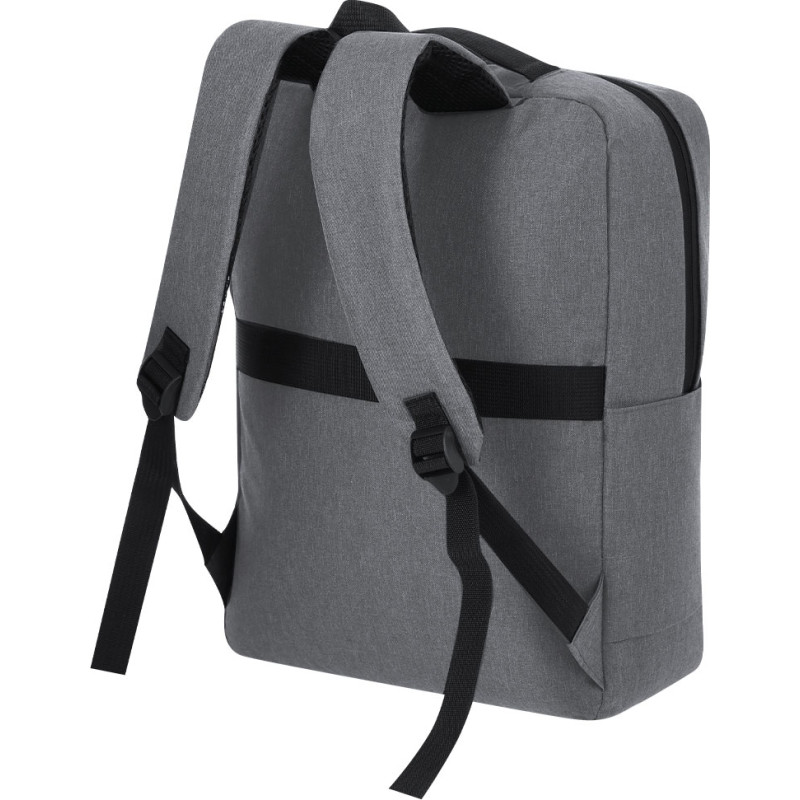 Backpack made from soft RPET 600D polyester. With a main pocket with double pull zipper closure. Interior pocket for laptops up to 15 inches. Includes two front pockets with invisible zipper closures and side pockets. Padded adjustable back and straps. Includes strap for trolley or suitcase adjustment, ideal for travel. With RPET label on the tag. The RPET material is made from recycled plastic, promoting the reuse of plastic waste and helping the planet's sustainability.