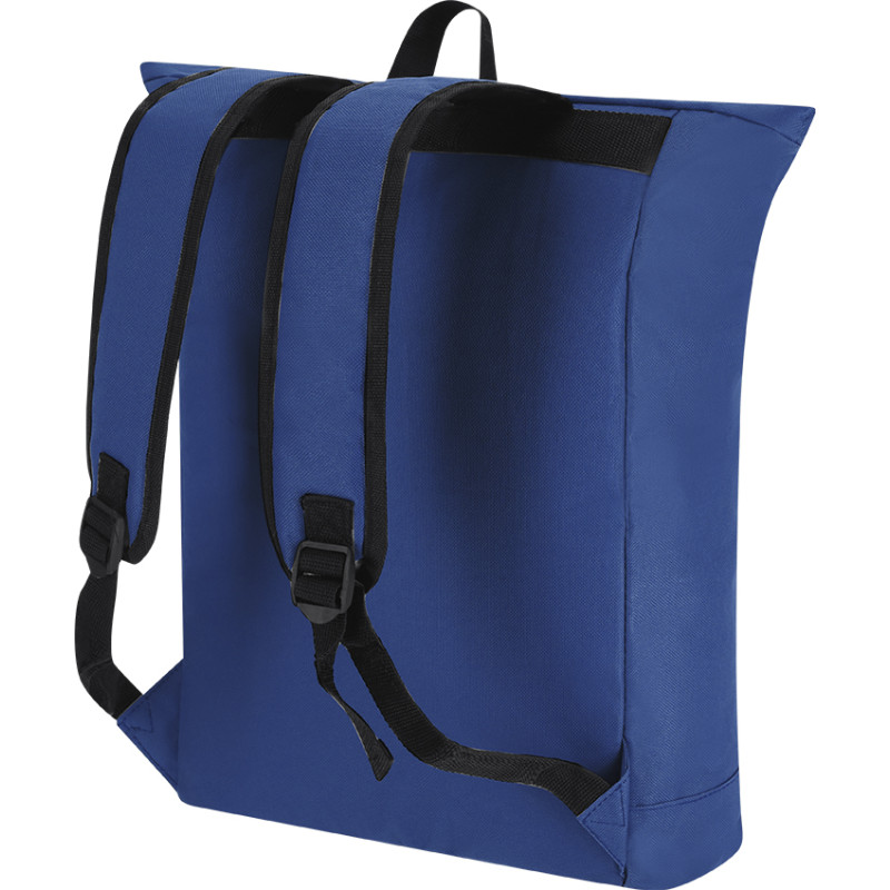 Backpack made of durable RPET 600D polyester. Features a main pocket that closes with a buckle, with padded compartment for laptop up to 15 inches, and an additional front pocket with zipper closure. The shoulder straps are padded and adjustable. RPET logo on the tag and black accessories.RPET material is made from recycled plastic to promote the reuse of plastic waste and help the sustainability of the planet.