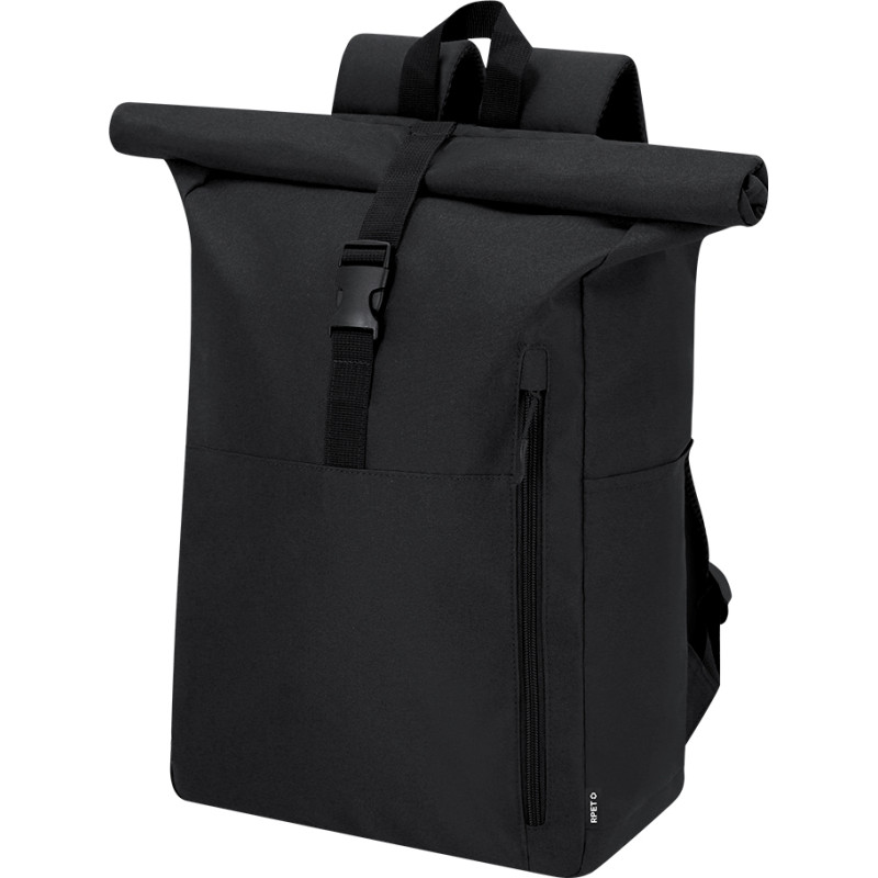 Backpack made of durable 300D RPET with roll-top closure and buckle. Features two front pockets, a rear pocket with side access, and two additional side pockets. Spacious interior with padded compartment for laptops up to 15 inches. Padded shoulder straps and back. Includes trolley strap for easy attachment to suitcases, ideal for travel and commuting. RPET material is made from recycled plastic, encouraging the reuse of plastic waste and helping to promote the planets sustainability.