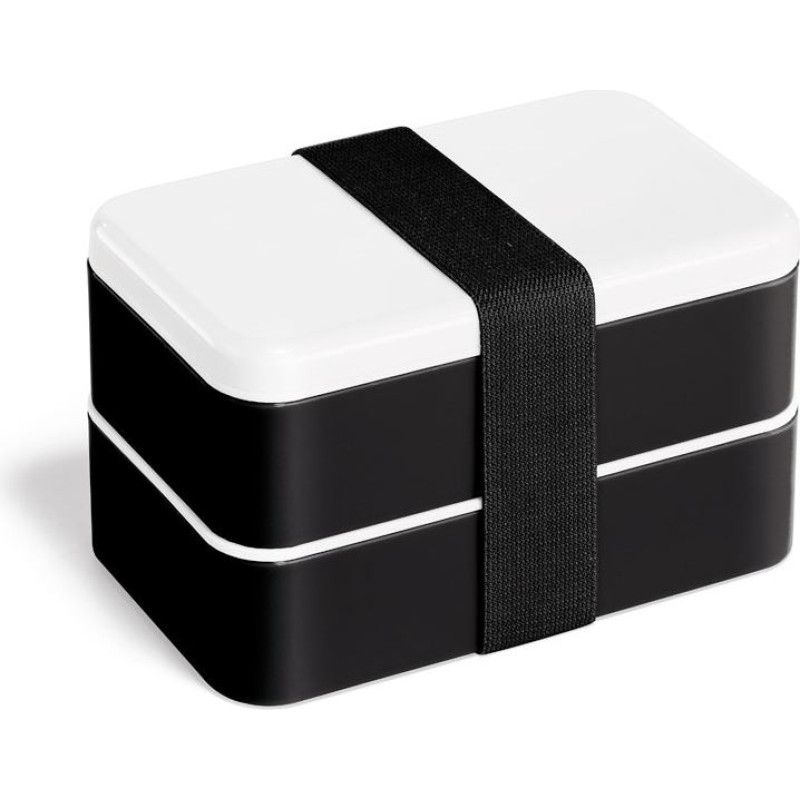 PP and PS lunch box with 2 compartments (680 mL each) and 1 removable divider. Includes 3 pieces of cutlery: fork, knife and spoon. Closes with an elastic band and is suitable for microwave (remove lid). 180 x 100 x 100 mm