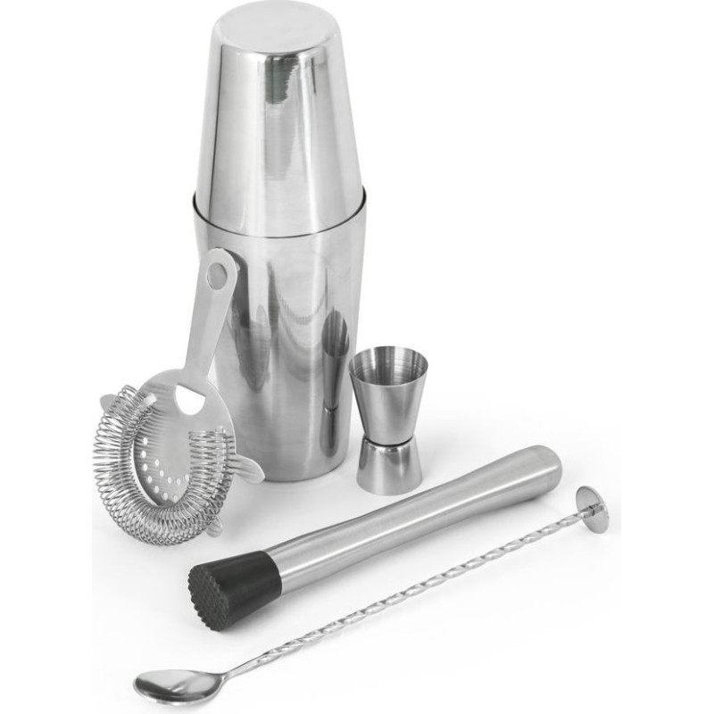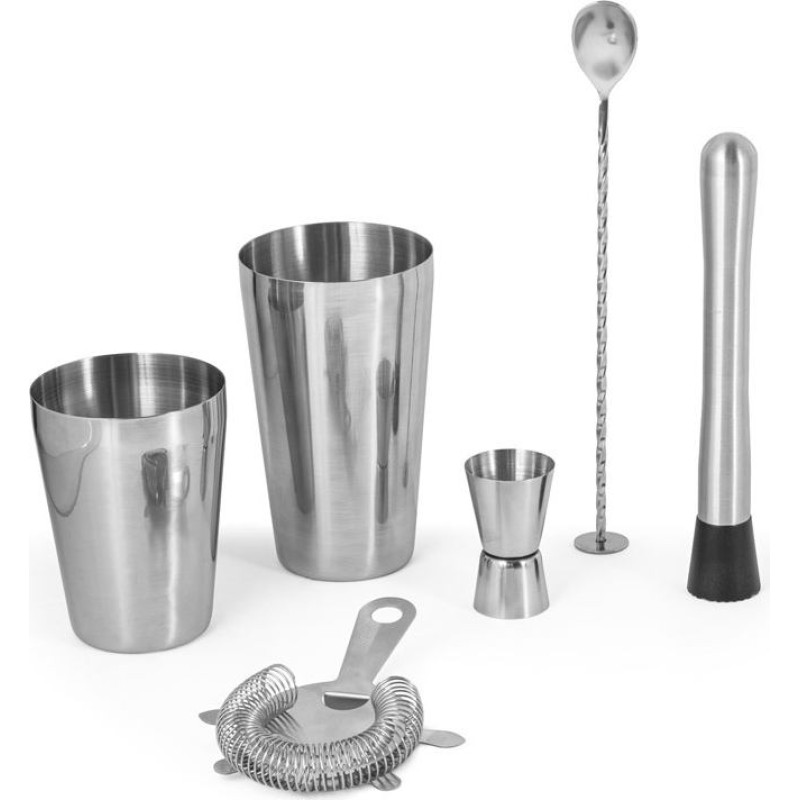6-piece stainless steel cocktail set: a shaker (600 + 450 mL), a measuring cup (30 mL), a spoon, a pestle and a strainer. Includes a non-woven pouch. Supplied in a gift box. Box: 98 x 98 x 290 mm