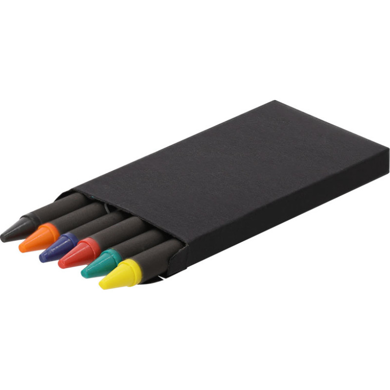 Set of 6 crayons in a black recycled cardboard box. The recycled cardboard comes from the reuse of manufacturing excess and the recycling of paper at the end of its useful life, becoming an eco-friendly and sustainable canvas.