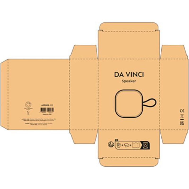 DaVinci 10W speaker with rABS body and rPET grill. Powered by a 2600mAh battery, it fuels 10 hours of dynamic play. Uniquely, the removable grill offers direct printing, personalizing your experience. It also offers a IPX4 protection. Includes a carrying strap to easily transport. Charging time from 3 to 4 hours through the USB-C connection. All packed in an individual kraft box.