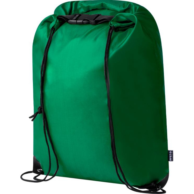 Drawstring backpack in soft RPET 210T polyester. With safety buckle closure and self-closing strings. Reinforced corners, metal eyelets and outside label with RPET logo. Available in a wide range of colours (white colour specially made for sublimation printing).RPET material is made from recycled plastic, thus promoting the reuse of plastic waste and helping the sustainability of the planet.