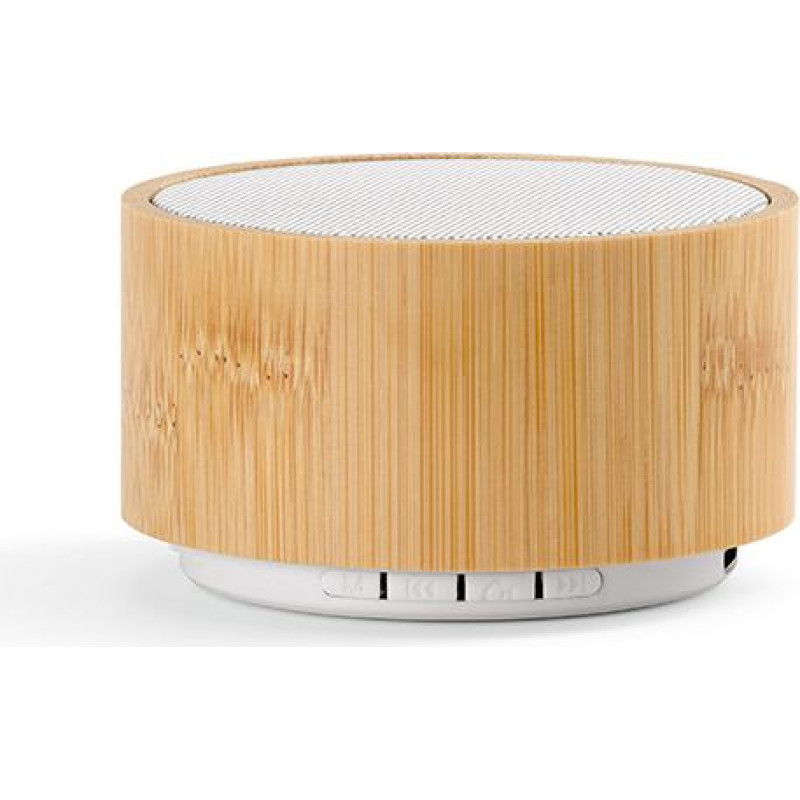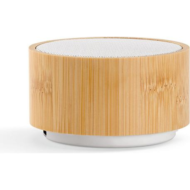 Einstein bamboo and rABS speaker. Delivering 3W of sheer auditory delight, this speaker is a marvel. Its USB-C charging door ensures convenience. With 400mAh, enjoy 3 hours of lively playtime. Charging time of about 1h. White grill supplied separately to allow full colour print on entire surface. Packed inside an individual kraft box.