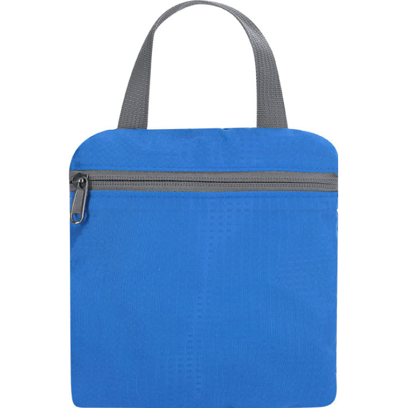 Foldable backpack made of soft RPET Ripstop 210D polyester. Main pocket with double drawstring closure, dual-function inner pocket, and front pocket with clip closure. Reinforced corners with mesh, adjustable shoulder straps, and gray accessories. Small size when folded, with a transport handle. RPET emblem on the tag.RPET material is made from recycled plastic, promoting the reuse of plastic waste and helping to sustain the planet.