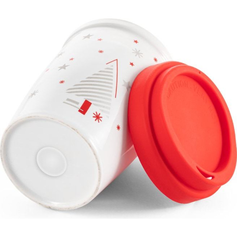Double-walled porcelain travel cup with Christmas decoration. With silicone lid and capacity up to 280 mL. Supplied in a customized box. ø86 x 122 mm