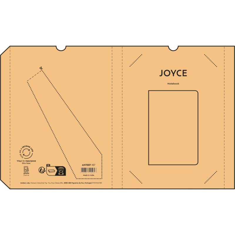 Joyce A5 notebook with Banana cover. 196 recycled 80gsm dotted pages with a marked space for your date and page info, encased in a softcover. Enhanced with a flysheet carrying a story, a blend of purpose and style. Supplied in an individual kraft sleeve.