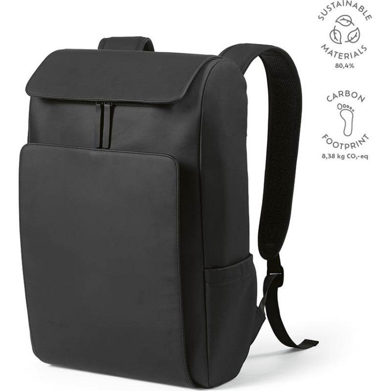 The Lisbon 20L backpack is made of recycled PU. It is sustainable and spacious with a top compartment ideal for sunglasses, drinks bottles, or other travel necessities. It features a large front compartment and a separate padded laptop sleeve in the back (15.6"). Two side pockets, padded straps and a trolley strap all provide additional comfort. Delivered in an individual recycled cotton bag and individual kraft box.