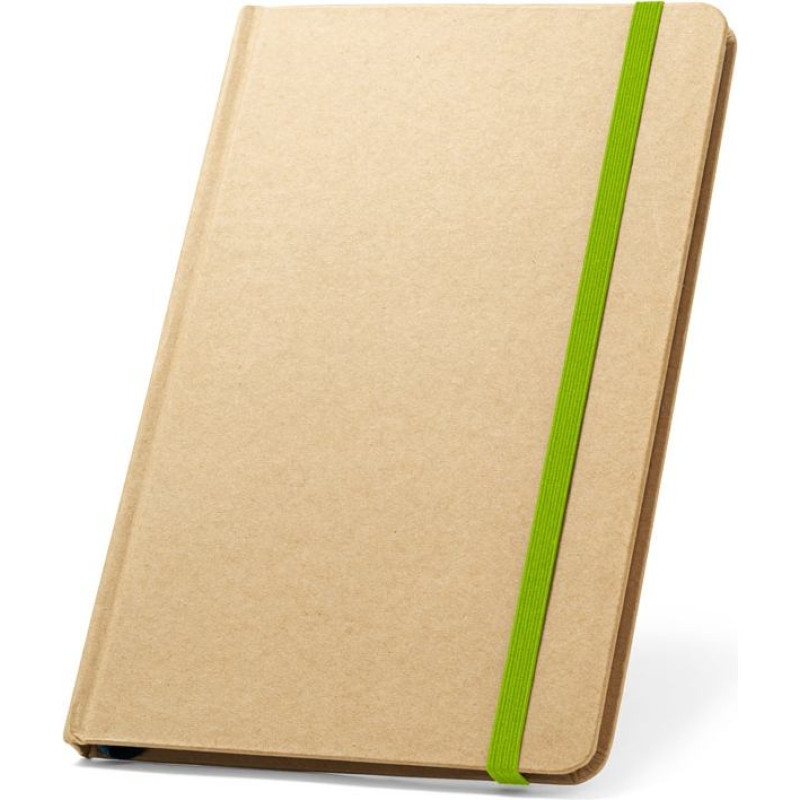 A5 notepad with 160 lined paper pages and hardcover in cardboard. Contains bookmark ribbon and elastic band matching color. 137 x 210 mm
