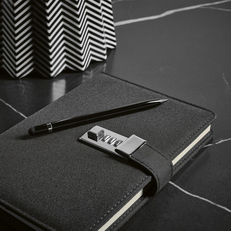 The Melville A5 is a lockable notebook with 300D rPET cover. It features a removable notebook with 192 FSC pages of 70 gsm plain ivory paper with a designated space for date and page number. It includes two interior pockets so you can organize yourself.