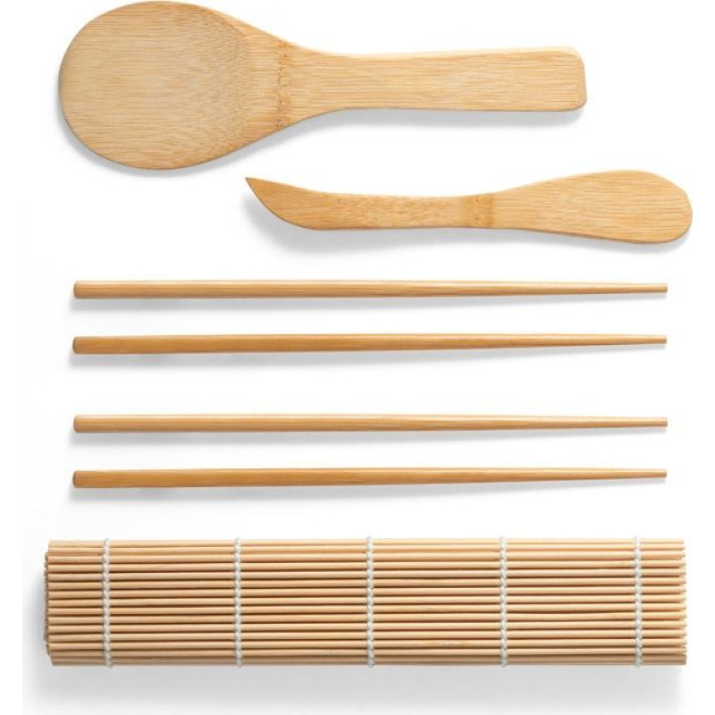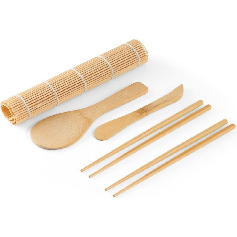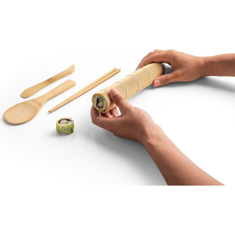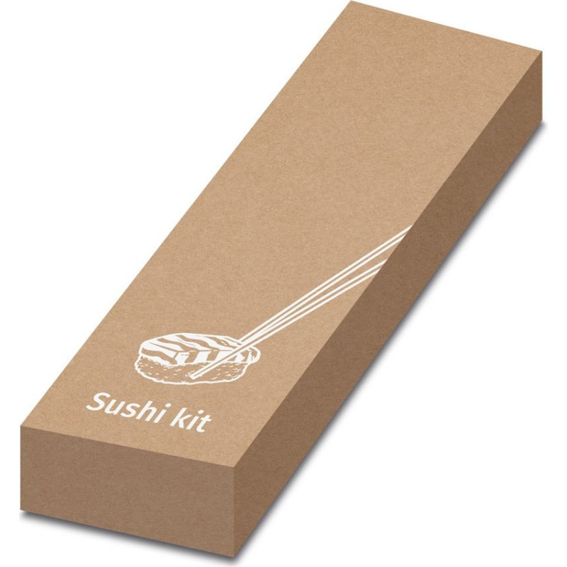 Sushi set in bamboo with a mat, 2 pairs of chopsticks, 1 spoon and 1 knife. Supplied in a kraft paper gift box. As the product is made from natural materials, the colour and the printing result may vary between products. Box: 245 x 100 x 33 mm
