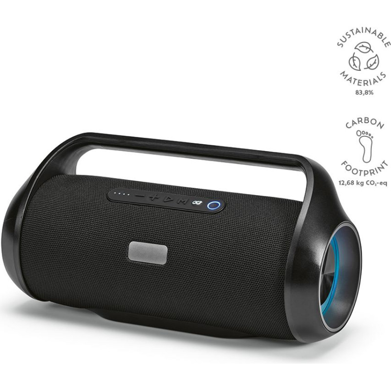 Newton speaker delivering 40W (20x2) power and crafted from rABS, this speaker resonates with clarity. A 6000mAh battery fuels 5 hours of immersive play. IPX5 waterproof, it's your musical companion. Wireless 5.0 connection extends the range up to 10m and TWS function. Charging time from 2 to 3 hours through the USB-C connection. Supplied in a PE polybag and kraft box.