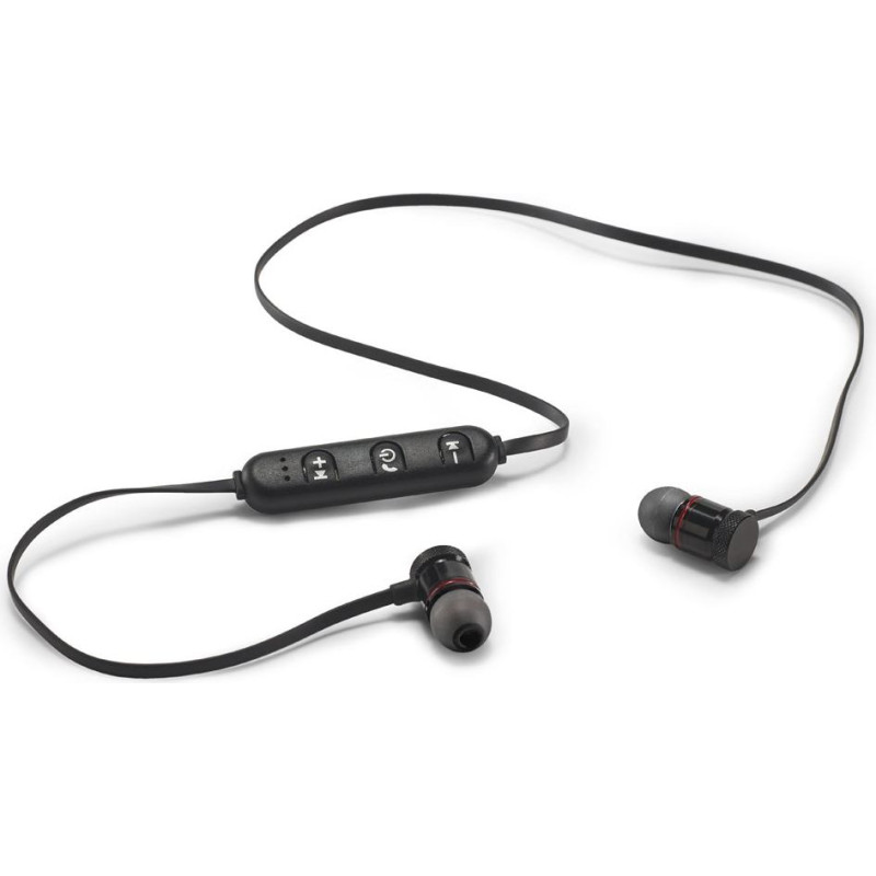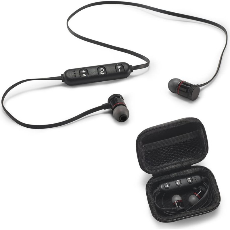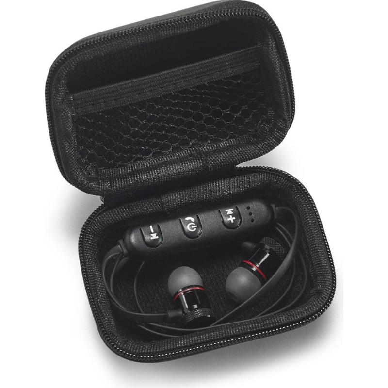 Wireless magnetic earphones in recycled ABS (100% rABS). With BT v4'1 transmission and a 55 mAh battery, they provide an autonomy of approximately 3 hours. The earphones allow you to answer calls, control the volume and playlist of your mobile device. Includes a USB charging cable. Supplied in an EVA pouch. 80 x 65 x 32 mm