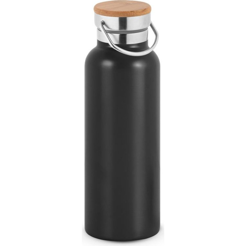 Stainless steel (36% recycled) double-walled vacuum insulated bottle. Bamboo lid and stainless steel carrying handle. Capacity up to 570 mL. Supplied in a kraft paper gift box. As the product is made from natural materials, the colour and the printing result may vary between products. ø70 x 220 mm | Box: 75 x 227 x 75 mm
