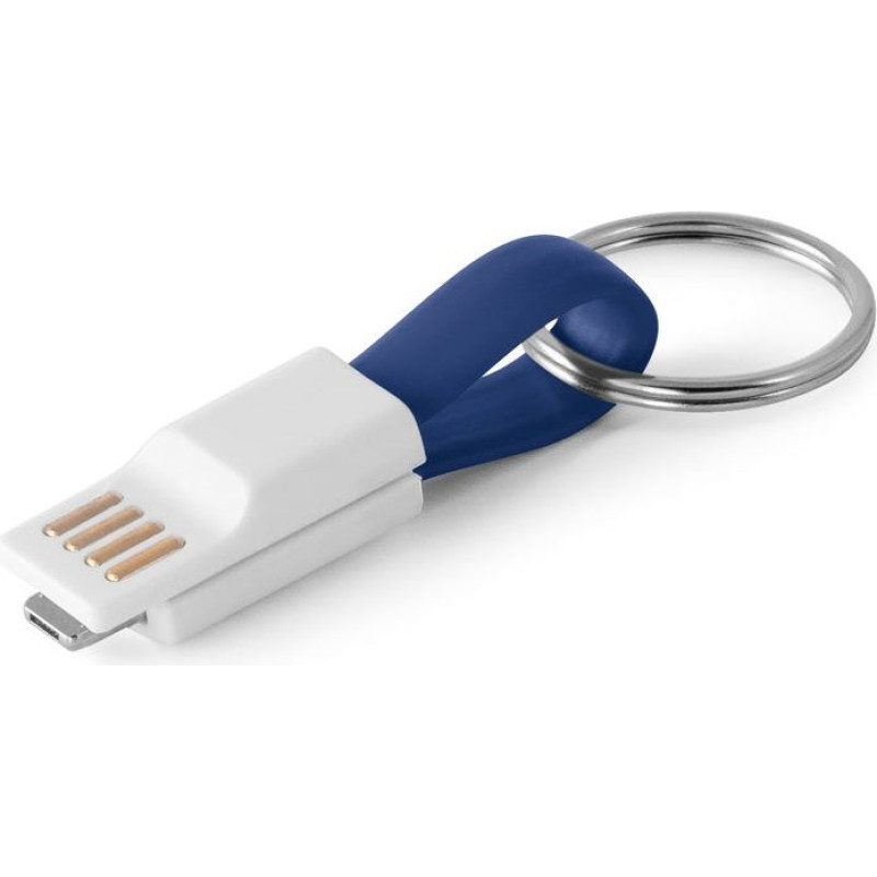 USB cable with 2-in-1 connector. This ABS and PVC product is suitable for charging mobile devices and is compatible with micro USB ports and iOS operating system. This customisable product contains a keyring. 12 x 50 x 10 mm