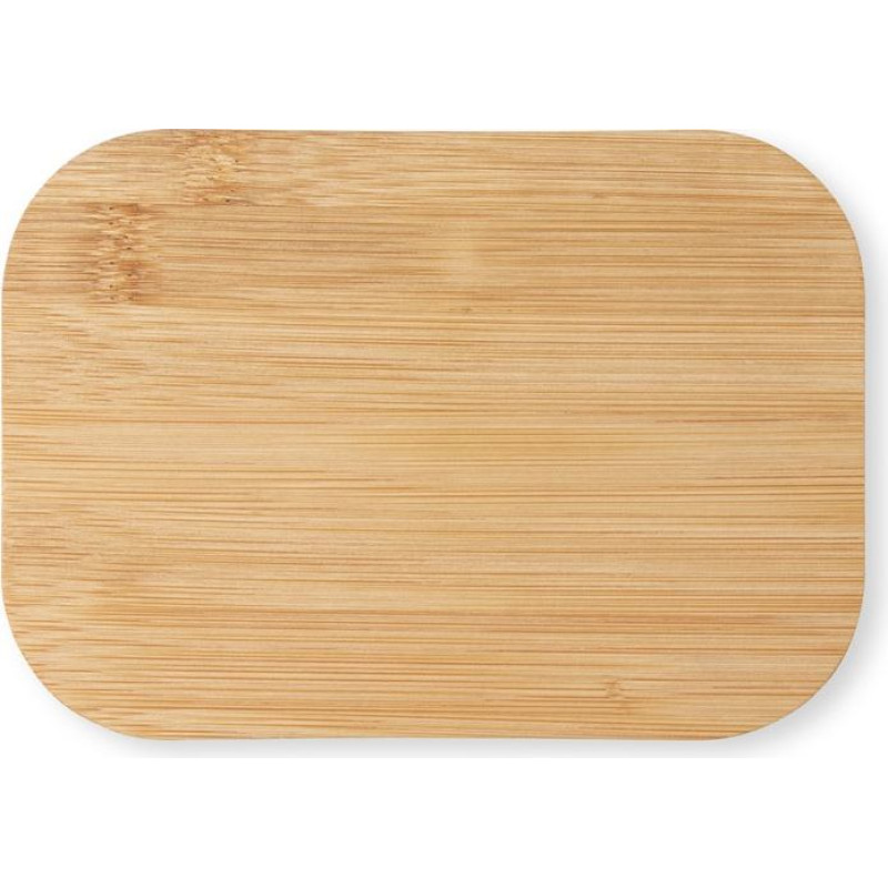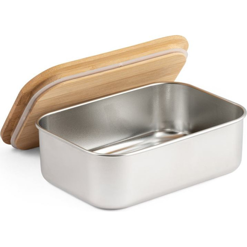 Stainless steel lunch box with bamboo lid and an elastic band for safe carrying. Capacity up to 800 mL. Supplied in kraft box. As the product is made from natural materials, the colour and the printing result may vary between products. 165 x 115 x 52 mm