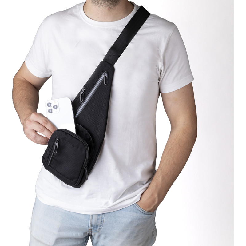 This 300D polyester messenger bag offers multiple pockets for an effective organisation. Two main pockets are located on the front and side, along with two additional pockets on the front and back. It is enhanced by a reflective strip on the central pocket for visibility. Presented individually in a recycled bag.
