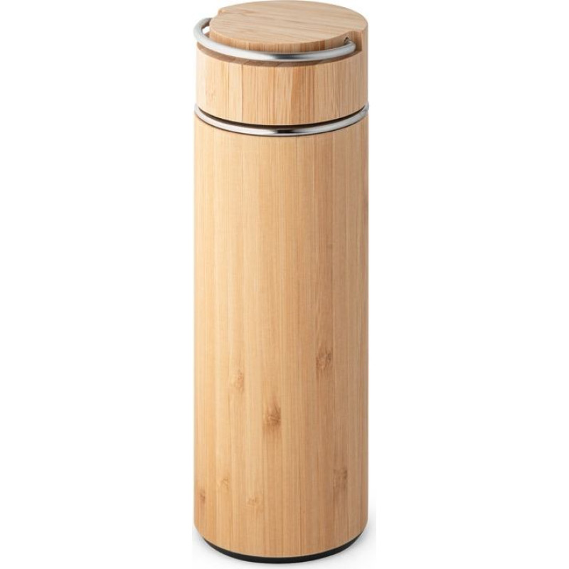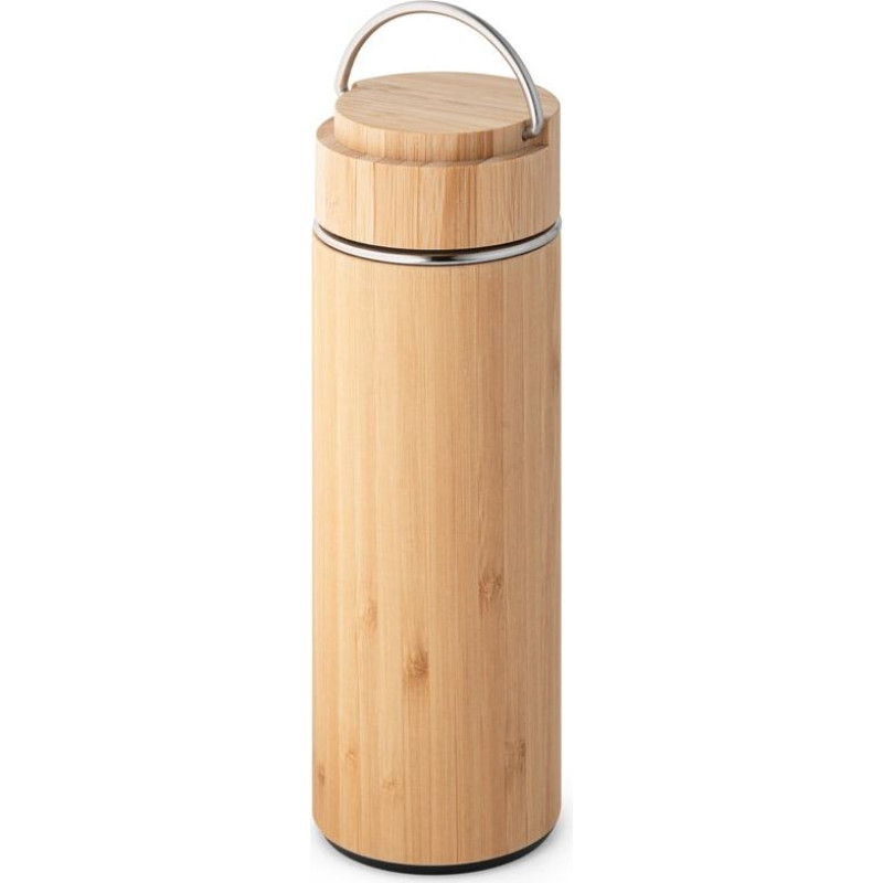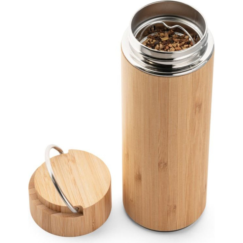 Bamboo and stainless steel thermal bottle with vacuum double body and tea infuser. This bottle has a capacity up to 440 mL and is supplied in a kraft paper gift box. As the product is made from natural materials, the colour and the printing result may vary between products. ø70 x 215 mm