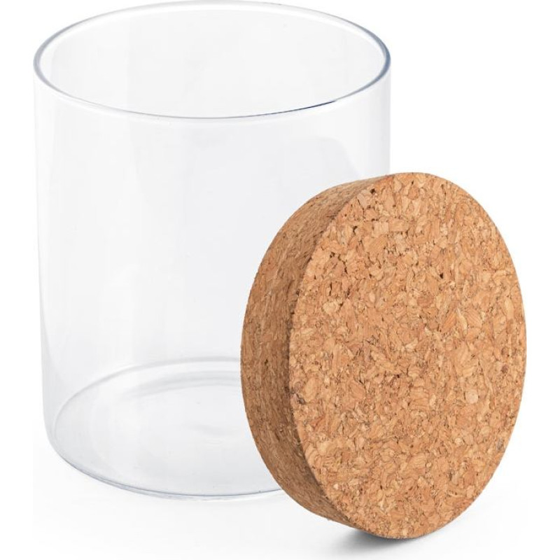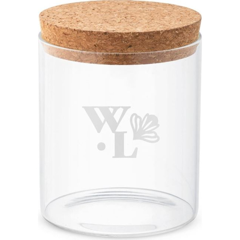 Borosilicate glass bottle with cork lid. Capacity up to 700 mL. Supplied in a kraft box. As the product is made from natural materials, the colour and the printing result may vary between products. ø95 x 110 mm