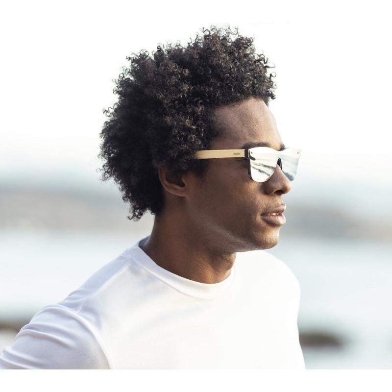 Nature line sunglasses with UV400 protection. Black frame in resistant PC material, with mirror effect lenses and arms made of natural bamboo. Presented in an attractive eco-design case.