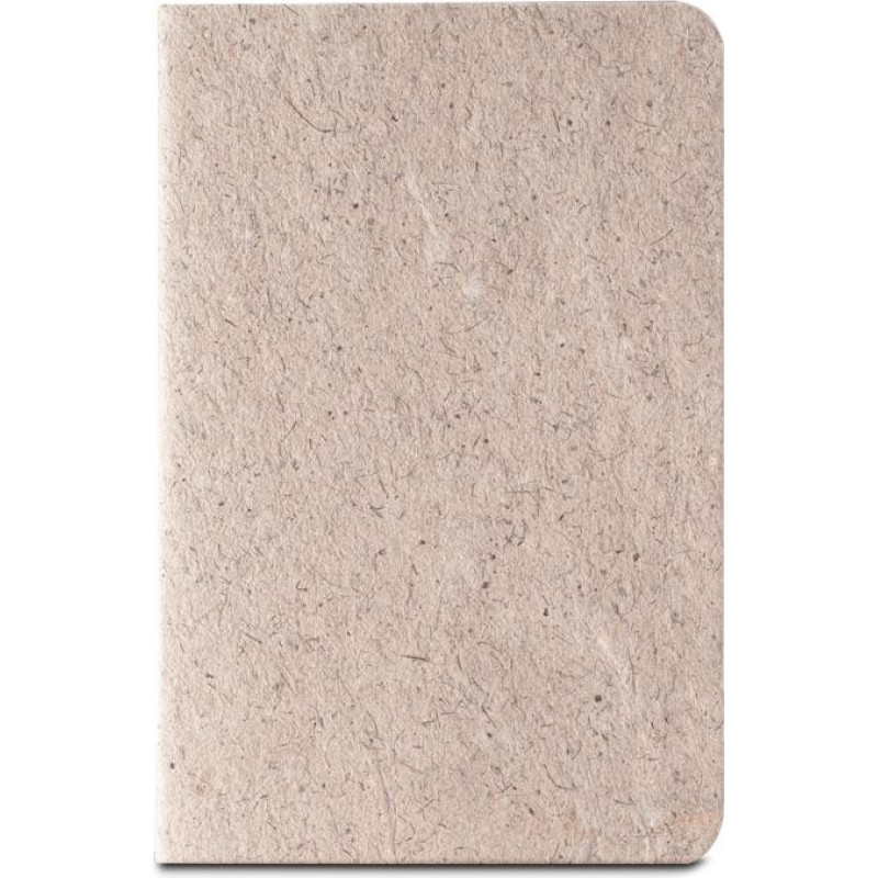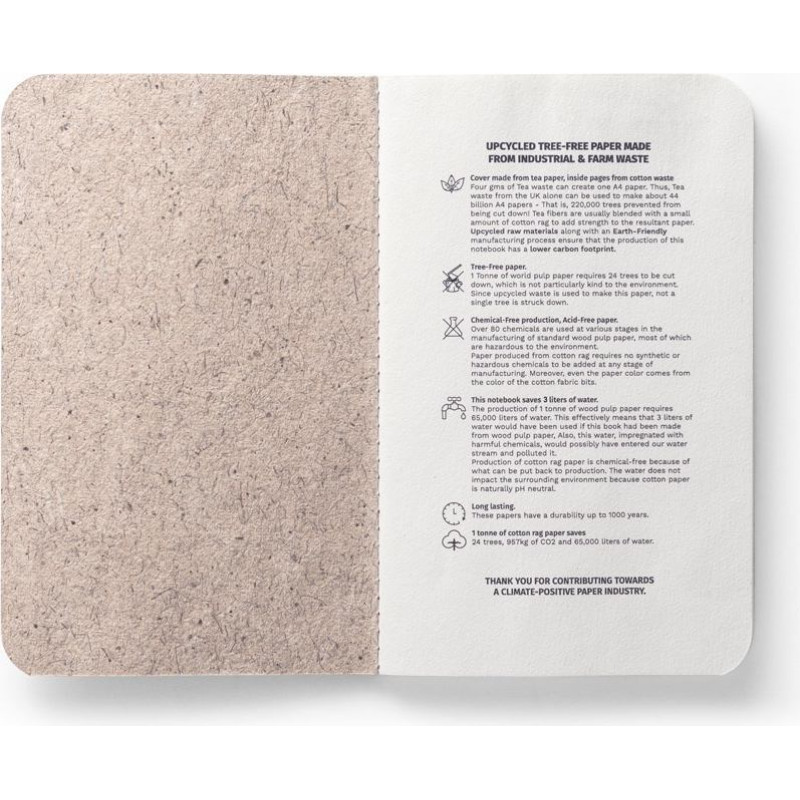 A6 notepad with flexible cover made from tea leafs waste (65%) and cotton waste (35%). The inner paper is made from cotton waste (100%) and is highly durable. Contains 52 plain pages and paper band with artwork. No waste was generated nor were any chemicals or trees used in the manufacturing process of this notepad. As the product is made from natural materials, the colour and the printing result may vary between products. 100 x 145 mm