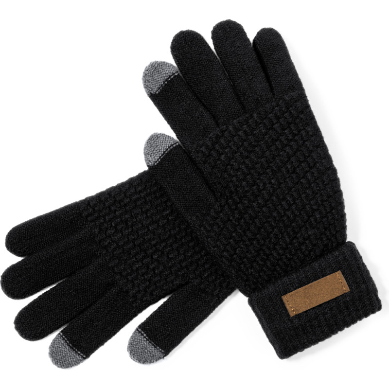 Practical pair of gloves for touchscreen devices. Made of RPET warm and soft polyester. Touch function on index finger and thumb. One size fits al for adults, with RPET label.RPET material is made from recycled plastic, thus promoting the reuse of plastic waste and helping the sustainability of the planet.
