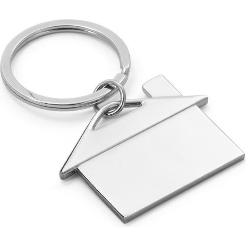 House-shaped metal keyring. Supplied in a kraft paper gift box. 49 x 36 x 3 mm