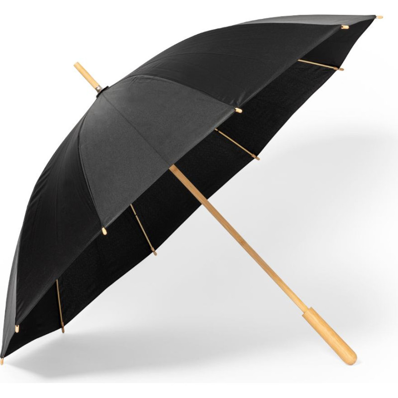 105cm diameter umbrella in 190T RPET pongee material. Manual opening and windproof mechanism, with fibreglass ribs an velcro closure. In an elegant bla colour, with straight handle made made in bamboo and RPET label.RPET material is made from recycled plastic, thus promoting the reuse of plastic waste and helping the sustainability of the planet.