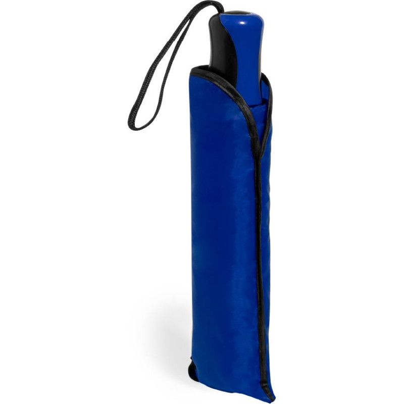 8-panel folding umbrella made in 190T polyester. Manual opening, with silver coloured metal ribs and velcro fastening. Ergonomic handle with carrying strap and matching protective sleeve. Available in a wide range of colours. Presented in an individual recycled bag.