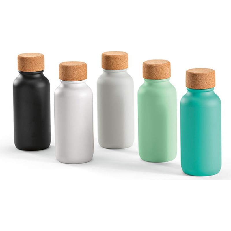 Volga 530ml (500ml net) single walled bottle with Cork lid made from recycled stainless steel. It features a sleek matte finish. The cork lid not only adds a touch of natural charm. Leakproof and packed inside an individual kraft box.