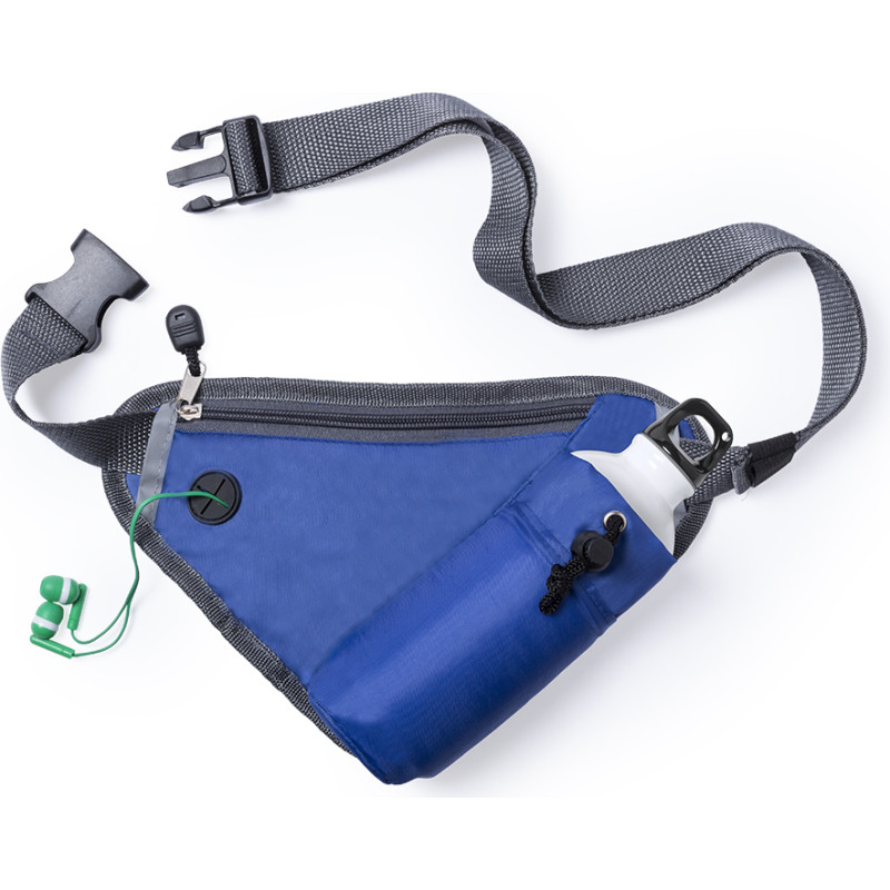 Triangular design waist bag in soft polyester 210D with varied colors. Designed for sports and leisure activities. With zipper pocket, headphone outlet, adjustable bottle pocket and adjustable waist band with buckle closure. Bottle not included.