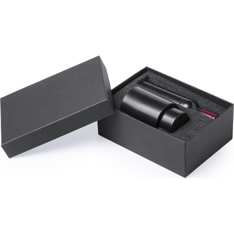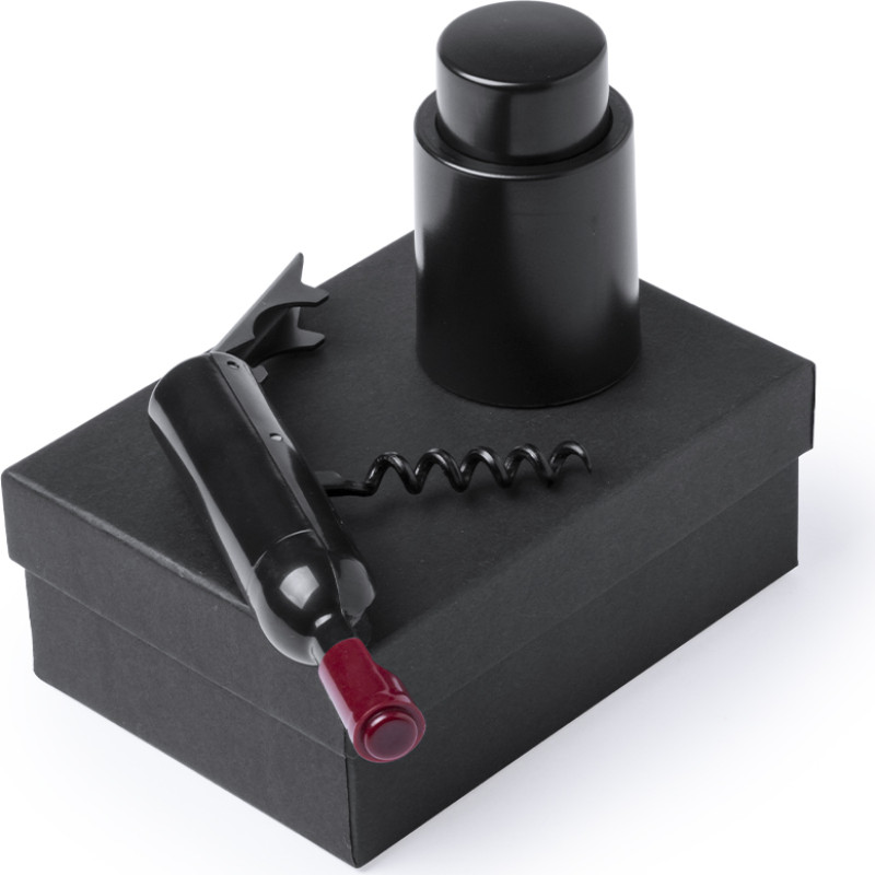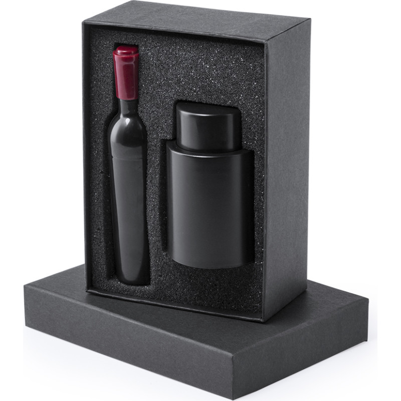 Bold design wine set. Including corkscrew in the shape of a wine bottle and vaccum bottle lid. Presented in an individual, black cardboard case with inside die-cut foam.