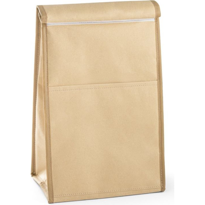 Paper cooler bag up to 4 L with non-woven lining and interior with aluminium thermal insulation. and self-adhesive hook and loop fastener and front pocket. Closed: 195 x 350 x 110 mm | Open: 195 x 410 x 110 mm