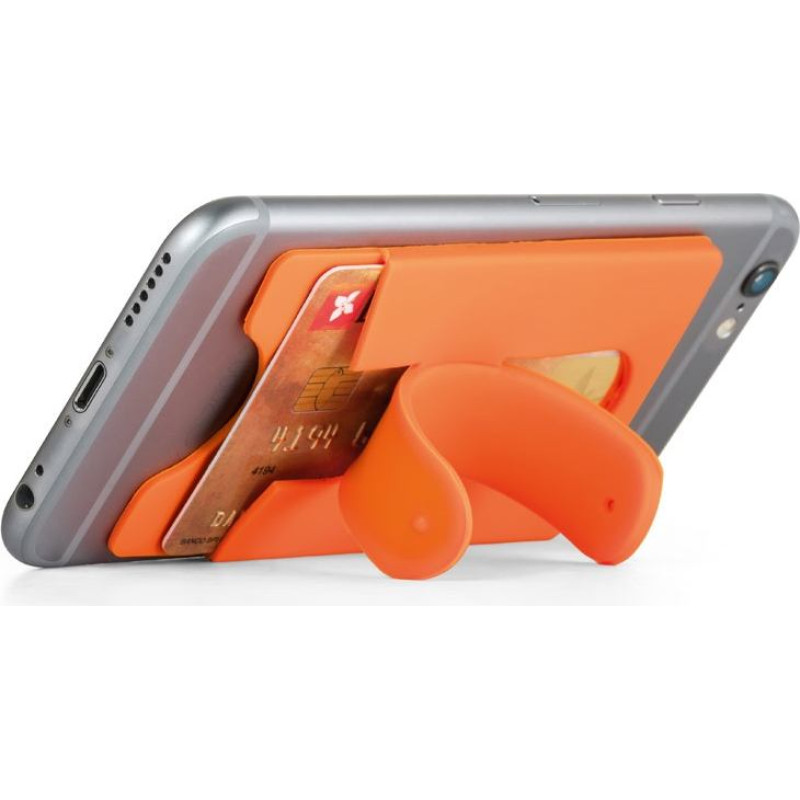Silicone smartphone card holder with a sticker on the back and flexible support. 57 x 96 x 5 mm