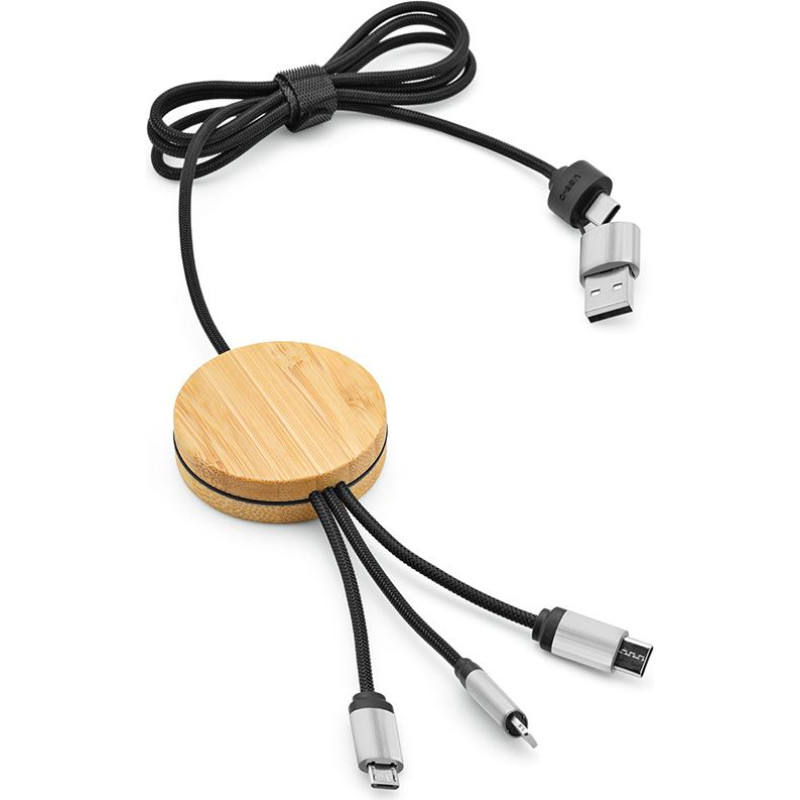 Feynman 5-in-1 multi cable, 1 meter charging cable with a body intricately crafted from bamboo and rPET. Featuring USB-A or USB-C to USB-C, Micro USB, Lightning and Wireless Charging (15W). Use connectors or wireless surface to connect devices. Elevate your tech experience while fast charging. The logo becomes backlit once personalized with laser. Packed inside and individual kraft pouch.