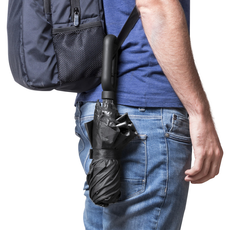 8-panel folding umbrella in a wide range of tones. 100cm in diameter, manual opening, with windproof system and in resistant pongee material. With black fiber ribs, velcro closure and ergonomic handle with built-in carabiner closure. Presented in a matching color individual case.