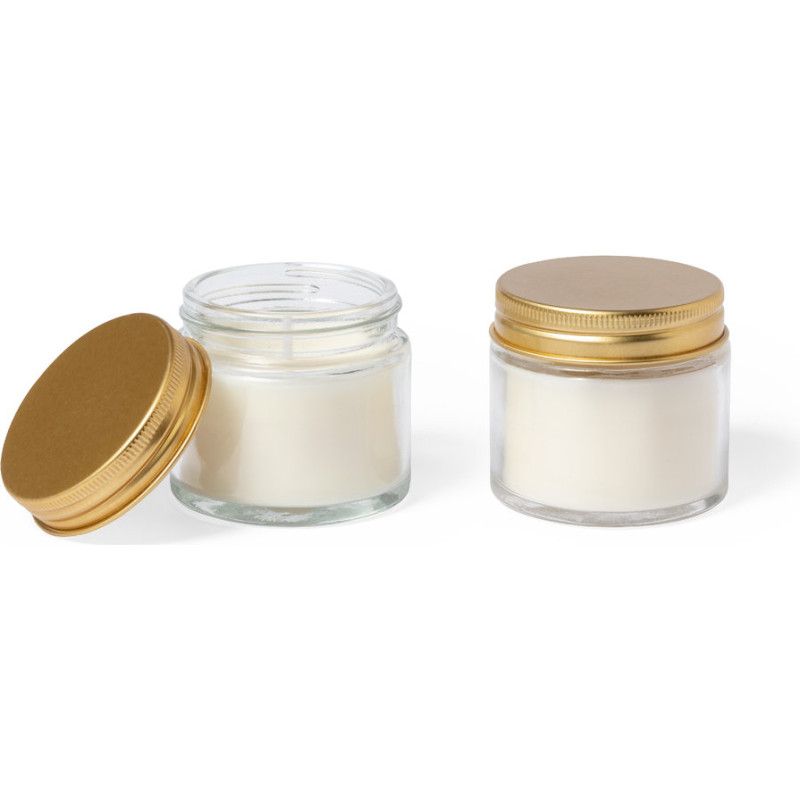 Set of scented candles, with vegetable wax and Fresia flower scent. In a glass jar with metallic screw cap and golden finish. Presented in an individual kraft box.