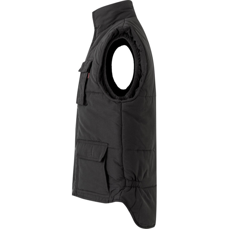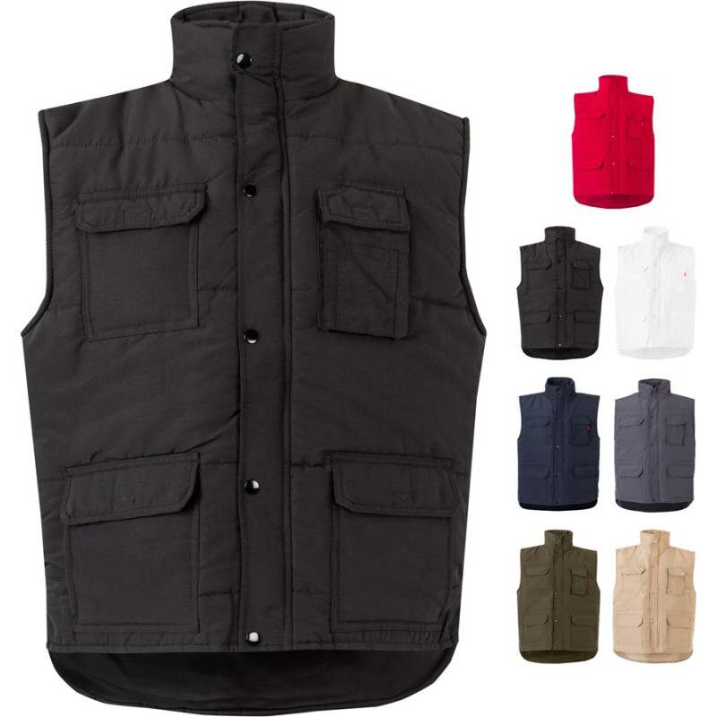 Multi-pocket quilted vest (220g/m²), in polyester (100%). With zip fastening, concealed by button placket. Elasticated waistband on the side and windbreaker in the armhole. With seven pockets (1 chest pocket, 2 lower pockets, 2 side pockets and 1 bellows pocket on the chest). Size: S, M, L, XL, 2XL, 3XL