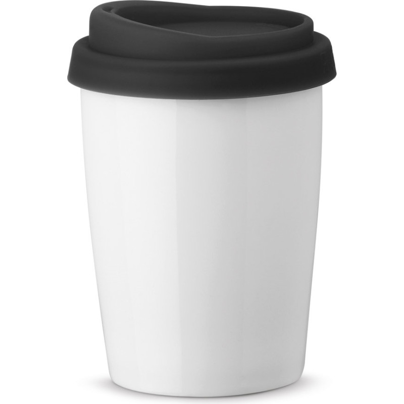 Porcelain travel cup with air-insulated double body, silicone lid and capacity of up to 220 mL. Supplied in a box. ø86 x 122 mm