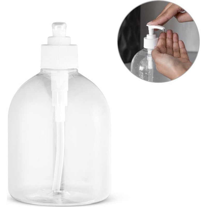 Bottle with dispenser in PE and PP. Volume-capacity 500 mL, refillable and reusable. ø85 x 150 mm