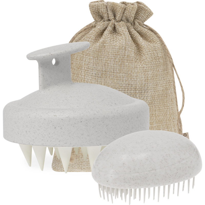 Personal Care Set for Hair. Includes:- Detangling Brush designed with flexible bristles of different lengths that detangle hair without pulling.- Massaging Brush that emulsifies shampoo while providing a massage and optimizes cleaning.Presented in a RPET drawstring bag.Wheat straw promotes the use of natural raw materials, thus reducing polluting emissions.